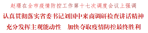 趙璟指出,在我市疫情防控掃尾階段,省委書記劉國中再次來商調(diào)研檢查,充分肯定我市近期工作成效,對我們一鼓作氣打贏疫情防控殲滅戰(zhàn)提出要求,充分體現(xiàn)了省委對商洛工作的高度重視和對全市干部群眾的深切關(guān)懷。全市上下要堅(jiān)持“外防輸入、內(nèi)防反彈”總策略和“動態(tài)清零”總方針,認(rèn)真貫徹落實(shí)劉國中同志講話精神,增強(qiáng)“時(shí)時(shí)放心不下”的責(zé)任感,充分發(fā)揮主觀能動性,始終保持良好狀態(tài),加壓加速、奮力沖刺,堅(jiān)決奪取疫情防控最終勝利,為黨的二十大勝利召開營造安全穩(wěn)定的社會環(huán)境。