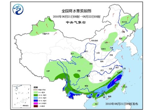 21日08時(shí)至22日08時(shí),西藏東部、青海東部和南部、川西高原等地有小到中雨(雪)或雨夾雪;新疆北部、甘肅南部、陜西南部、內(nèi)蒙古東南部、黑龍江大部、遼寧東部和西南部、華北東部、江南東部和南部、華南、西南地區(qū)大部有小到中雨或陣雨,其中,浙江中南部、江西南部、福建西部和北部、廣東北部、廣西東部和南部以及云南南部和西北部等地有大到暴雨,福建北部的局部地區(qū)有大暴雨;上述部分地區(qū)并伴有短時(shí)雷雨大風(fēng)等強(qiáng)對(duì)流天氣。新疆北部、內(nèi)蒙古中東部、東北等地有4~5級(jí)風(fēng)。
