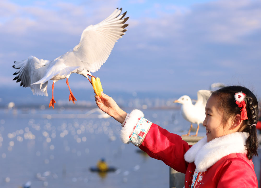游客在昆明滇池邊投喂紅嘴鷗(2024年1月17日攝)。新華社發(fā)(劉元嵩攝)