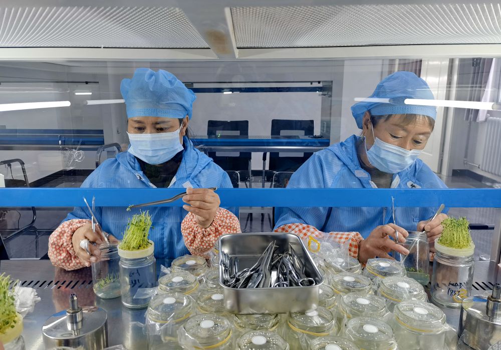 技術人員在河北省張家口市德勝村一處育種室內培育微型馬鈴薯瓶苗(2024年2月4日攝)。新華社發(fā)