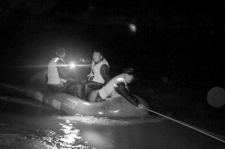 7時12分,各種救援物品運到現場,龍駒寨鎮的干部和丹鳳縣120急救人員也相繼趕到了現場增援。在劉丹鋒副局長的指揮下,300米長的繩索將橡皮筏兩頭牢牢拴住,數十條燈柱照在寬闊的河面上,鋪開一條光路,巡警隊李聃、舒浩哲和姚浩男三名民警主動請纓,登上橡皮筏,撐著竹竿向河對岸劃去。然而,橡皮筏到河中間后,多次遭遇急流失去方向,岸邊的人們一次又一次用繩索將被沖向下游的橡皮筏拽回。半小時過去了,橡皮筏還是過不了河,雨水已將所有人的衣服淋得濕透,民警們毫不氣餒,不斷地尋找新的路線。最后,他們冒險直接從上游急流處入水,隨急流下漂的3名民警奮力撐劃,終于成功抵岸,當晚8時05分,被困的周名連老人被安全救回。