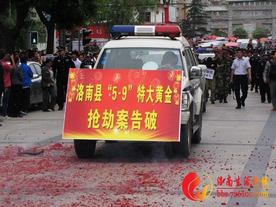 5月9日14時25分,兩名青年男子手持砍刀、斧頭闖入位于洛南縣城中甫街中段的“皇寶金店”,砸爛柜臺玻璃,搶走金手鐲6只,千足金項鏈59條,18K金項鏈47條,總價值近60萬元。