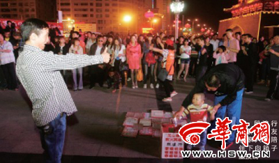 5月23日晚,商洛市丹江公園內(nèi),殷建行再次開始了義唱,圍觀的市民越來越多,虎永芳老人穿著義工服,維護(hù)著秩序。被殷建行的歌聲和善舉打動(dòng),市民、學(xué)生紛紛捐錢,幾百元、幾十元、幾元都有。