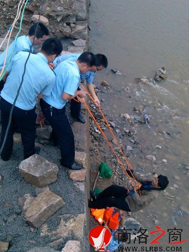 9月1日7時26分,柞水縣巡特警大隊接到縣局指揮中心處警指令:絲織廠大橋橋墩橫梁上有一名男子被洪水圍困,立即出警救援。巡特警大隊大隊長樊德鋒帶領七民警到達現場,發現一男子被洪水困在大橋下的橋墩橫梁上。連日來,由于持續陰雨,河水已快淹至橋墩橫梁,而在橋墩橫梁上躲避洪水的男子由于體力不支,已搖搖欲墜。樊德鋒立即組織民警攜帶保險帶、長纜繩、救生衣等救援器材開展營救,兩名突擊隊員強行渡河,將救生衣穿到被困男子身上,并綁上安全繩索,協同岸上民警,最終只用了10多分鐘就將該男子成功救起。