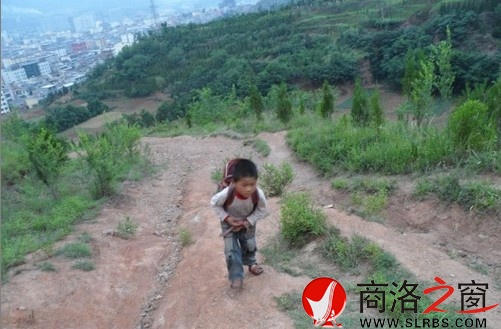 5月25日下午7時許,我一個人上雞冠山,家住焦樹凹在水泉幼兒園大班讀書的娃娃曹國慶一個人在上坡行走,背上還背著個小書包。(嶺南人 攝)