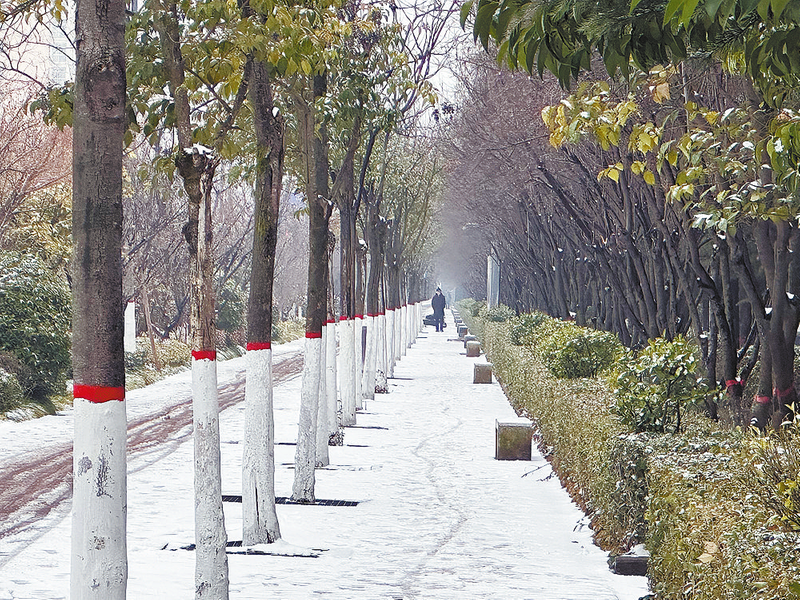 公園里,白雪鋪成了一條銀色大道。