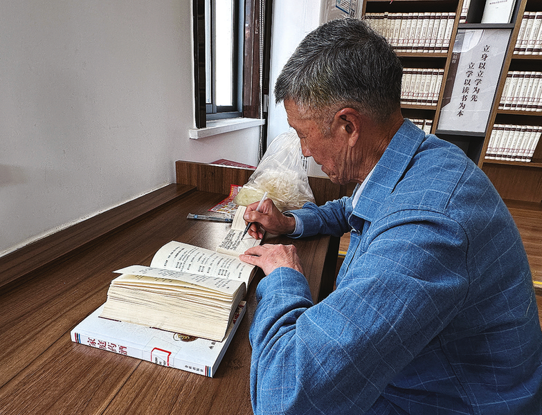 活到老,學到老。在市圖書館借閱區,一名老人正在寫讀后感。