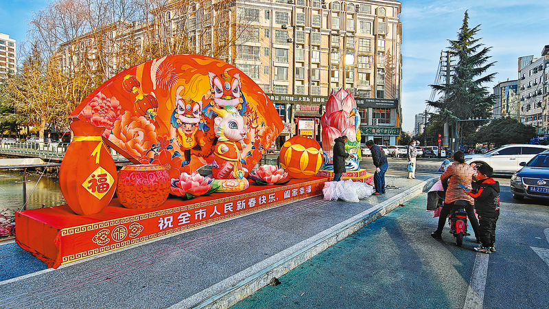 1月8日,市區(qū)通江路上,城市管理部門的工作人員在進(jìn)行蛇年彩燈的布置安裝。據(jù)了解,春節(jié)前將在市區(qū)主要路段陸續(xù)安裝布置節(jié)日彩燈,營造喜慶祥和的節(jié)日氛圍。 (本報(bào)記者 楊 鑫 攝)