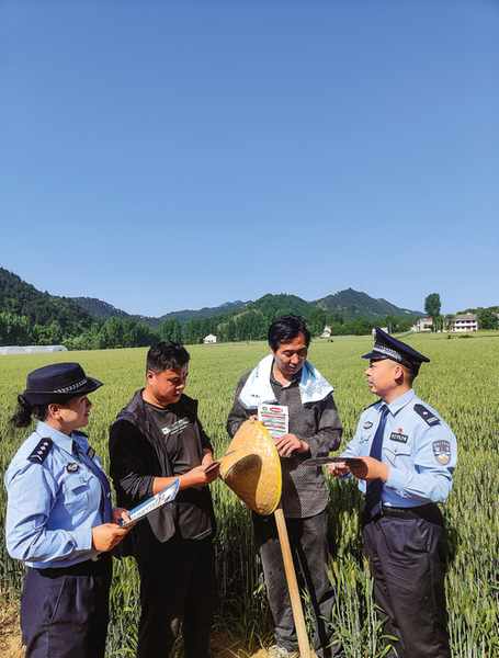 2024年5月20日,洛南縣公安局古城派出所所長(zhǎng)王振全(右一)帶領(lǐng)社區(qū)民警深入轄區(qū)何村,開(kāi)展主動(dòng)警務(wù)工作,向正在田間勞作的群眾宣講反詐知識(shí),講解識(shí)別電信詐騙的方法。 (本報(bào)通訊員 李重立 攝)
