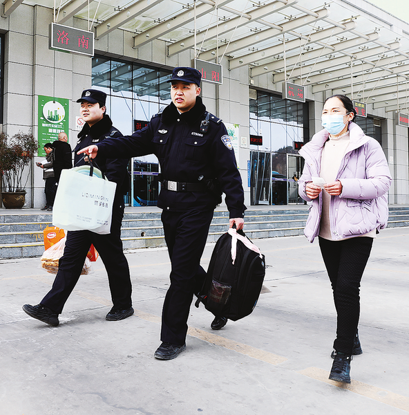 春節前夕,高新分局丹南派出所民輔警在商洛市汽車客運站執勤巡邏時幫助返鄉旅客搬運行李。(本報通訊員 王 丹 攝)