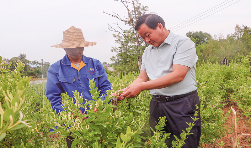 6月2日,四皓街道干部在指導村民采摘金銀花。當前,四皓街道中心村的300畝金銀花喜獲豐收,村民抓住晴好天氣在田間采摘。