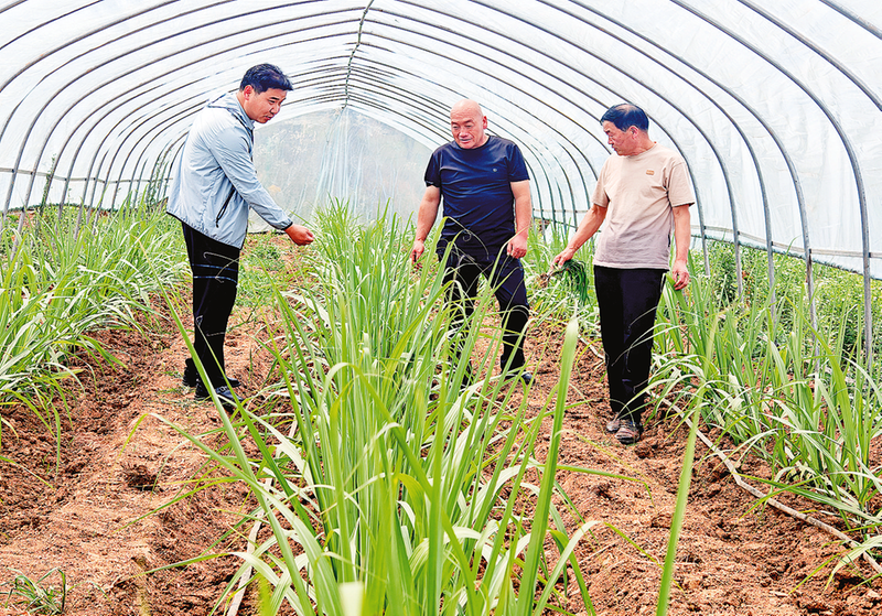 甘蔗通常是南方農作物,對氣溫和光照要求較高,適宜在熱帶、亞熱帶地區種植。然而,去年以來,四皓街道柳樹洼村勇于探索“南蔗北種”,通過采用棚中棚、棚下膜的措施,成功攻克了甘蔗種植難題。目前,村里發展有黃皮、黑皮兩個品種的水果甘蔗30多畝。圖為5月28日,村干部在甘蔗基地查看甘蔗生長情況。