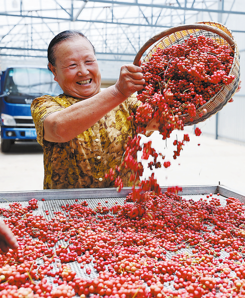 近日,洛南縣保安鎮黑潭村五味子進入采摘期。紅色的五味子好像瑪瑙,為這個豐收季增添了許多喜悅。圖為8月19日農戶搶抓晴好天氣采收果實。 (本報通訊員 阮世喜 攝)