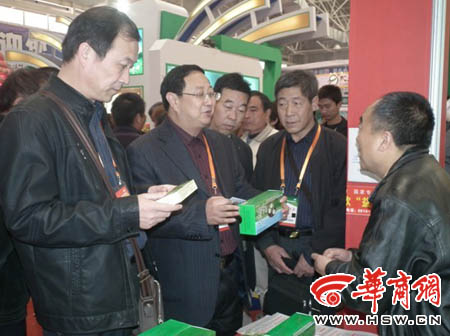 商洛市農業(yè)局局長劉清民(左二)副局長紀栓曹(左一)在參觀第十七屆農高會商洛展團時,向公司牛興民董事長(右一)詳細了解產品的研發(fā)和銷售情況