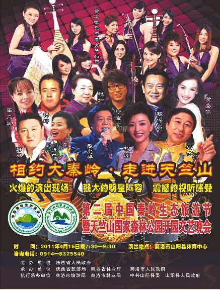 據(jù)山陽縣旅游局工作人員介紹,“相約大秦嶺-走進天竺山”文藝演出將由著名主持人趙保樂、楊瀾擔(dān)任主持,還將邀請著名相聲演員馮鞏,影視演員黃圣依,歌星沙寶亮、楊坤、張也、韓磊、王二妮,著名主持人趙忠祥、雅坤以及紫鳳鳴樂中國女子樂團等國內(nèi)知名藝術(shù)家和省市名角同臺演出。演出內(nèi)容以商洛旅游特色為主,結(jié)合山陽旅游文化、風(fēng)土人情等主題,將呈現(xiàn)給大家一場精彩、震撼的視聽盛宴。