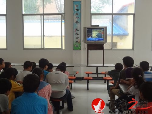 圖為柞水縣干佑中學近千名師生同步收看中央電視臺直播太空授課實況。(張曉鋒 項小華 攝) 商洛日報訊 6月20日上午十時許,我">