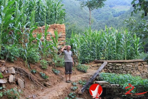 好不容易翻過坡、走過平洼地,再爬到另一座山的半山腰,才看到了一些玉米地,眼里漸漸地顯出一戶人家,那是用石塊砌成的房屋,門檻上坐著一個個子矮矮的、佝僂著身子的老人,她是王忠慶的老伴。一聽說有人來找王忠慶,便著急的用手中的拐杖指著房子側面的山坡。原來,王忠慶去山上的地里鋤草去了,剛走不久。