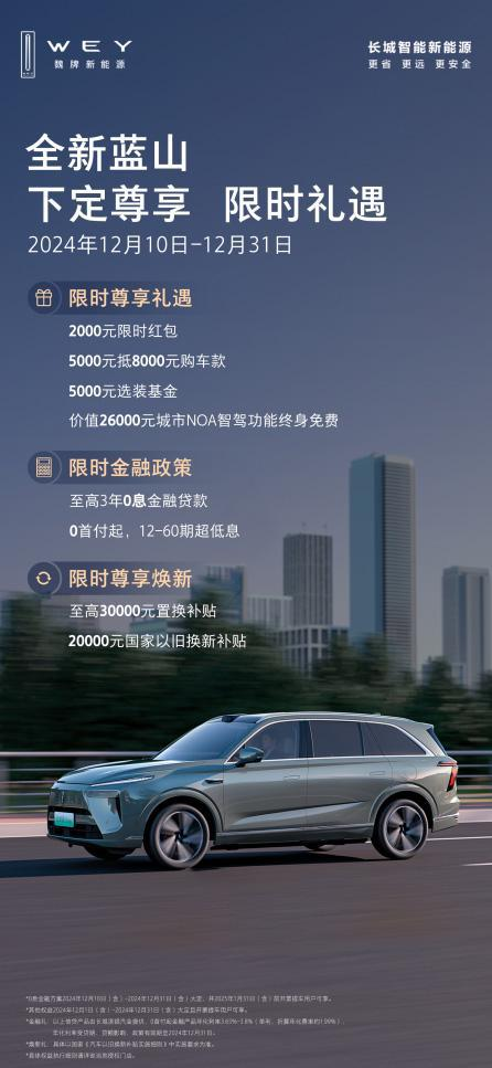 顯而易見,從央視權威背書到銷量數據的穩健增長,魏牌全新藍山正以出色的產品實力和市場表現,成為越來越多中國家庭的信賴之選。臨近年底,隨著最高20000元的國補換新政策進入尾聲,全新藍山福利加碼推出至高3年0息金融貸款,首付0元起,最長60期的超低息方案,為用戶帶來更加靈活的購車選擇。且現在購買魏牌全新藍山還可尊享限時禮遇,包含2000元下訂紅包、5000元膨脹補貼直抵8000元購車款、價值26000元的城市NOA智駕功能終身免費以及5000元選裝基金,為用戶打造專屬座駕。如果你也在尋求一款既豪華又實用的家庭座駕,魏牌全新藍山無疑是值得關注的選擇。