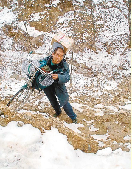 在老田所走的路上,除了一般的山路外,石道峪嶺和鳳凰嶺是他每次必須翻越的兩大山嶺,盡管現(xiàn)在通村水泥路能一直通到山頂,但由于坡度太大加之路程太長(zhǎng),老田每次都是扛著自行車走小路。“盤(pán)山路彎太大,走小路比較近,雖然累但能省時(shí)間,村民也能更早地拿到東西。”老田告訴記者,由于家庭經(jīng)濟(jì)差,上世紀(jì)90年代初期他應(yīng)聘當(dāng)了一名鄉(xiāng)村郵遞員,至今已經(jīng)19年了。目前,他的兒子和女兒都上了大學(xué),這一點(diǎn)讓他很欣慰。“天氣好的話走山路還好些,但幾天前剛下過(guò)雪,路就比較難走。”上石道峪嶺時(shí),老田提前給自己腳上綁上了防滑的鐵扣子,然后把自行車扛在肩膀上開(kāi)始翻山……