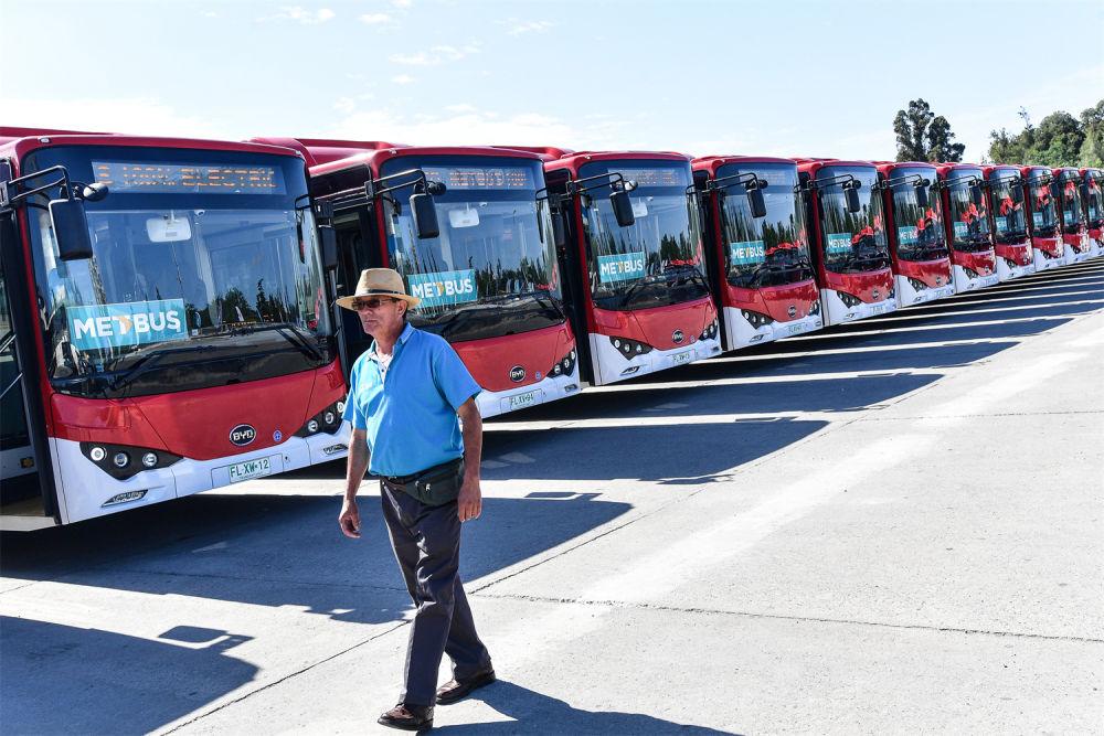 2018年12月13日,在智利首都圣地亞哥的奧伊金斯公園,一名男子從比亞迪電動大巴旁走過。新華社發(豪爾赫·比列加斯攝)