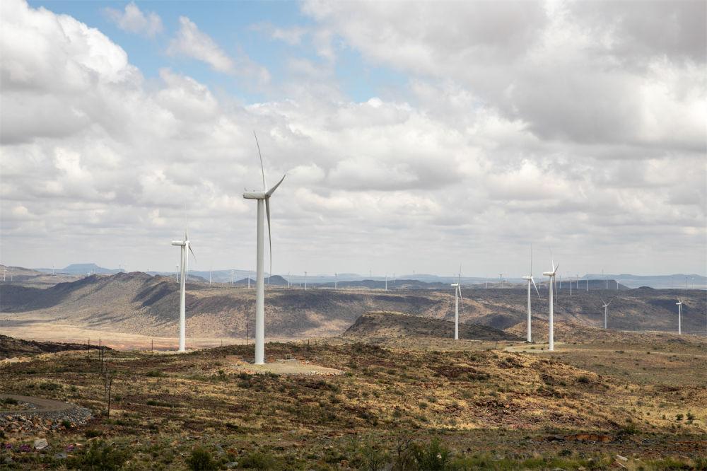 這是在南非北開普省德阿鎮拍攝的中國龍源電力集團南非公司運營的德阿風電項目風機(2021年11月22日攝)。新華社記者 呂天然 攝