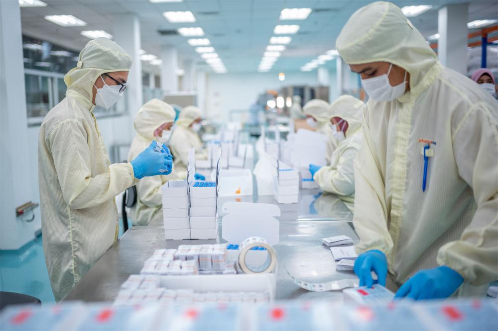 2021年10月5日,在馬來西亞吉隆坡郊區的發馬公司灌裝工廠,工人在包裝本地灌裝生產的科興疫苗。新華社記者 朱煒 攝