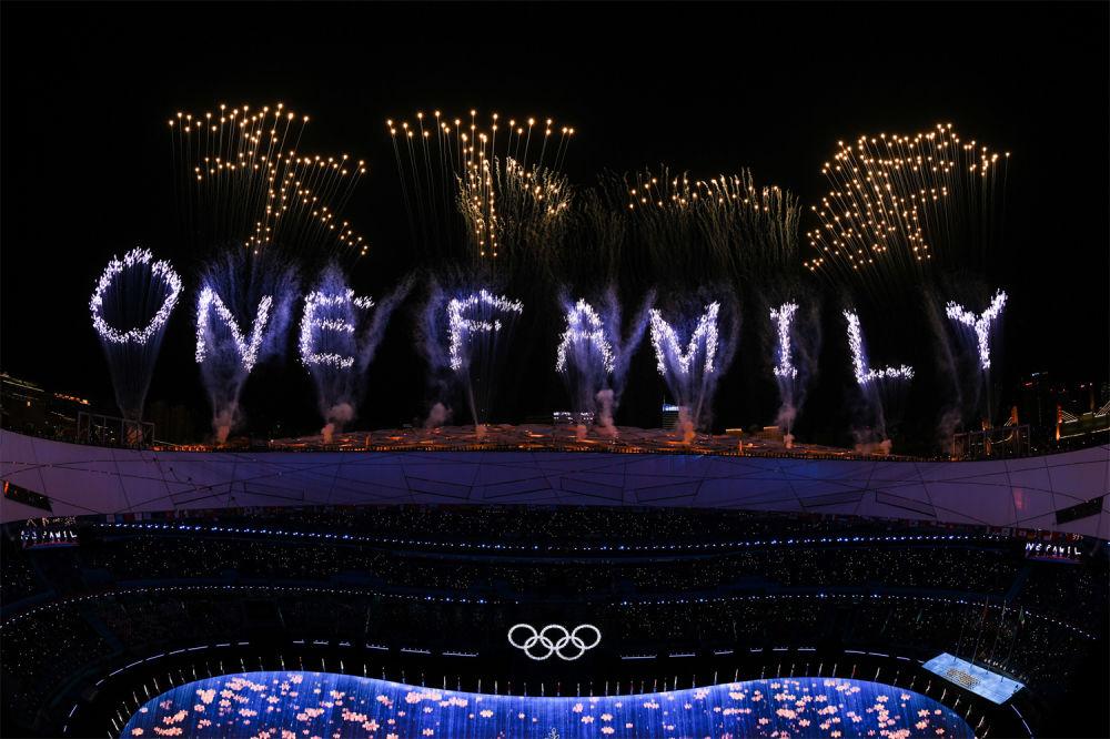2022年2月20日,中英文“天下一家”字樣造型的焰火在國家體育場上空絢麗綻放,為北京冬奧會閉幕式留下美好的永恒瞬間。