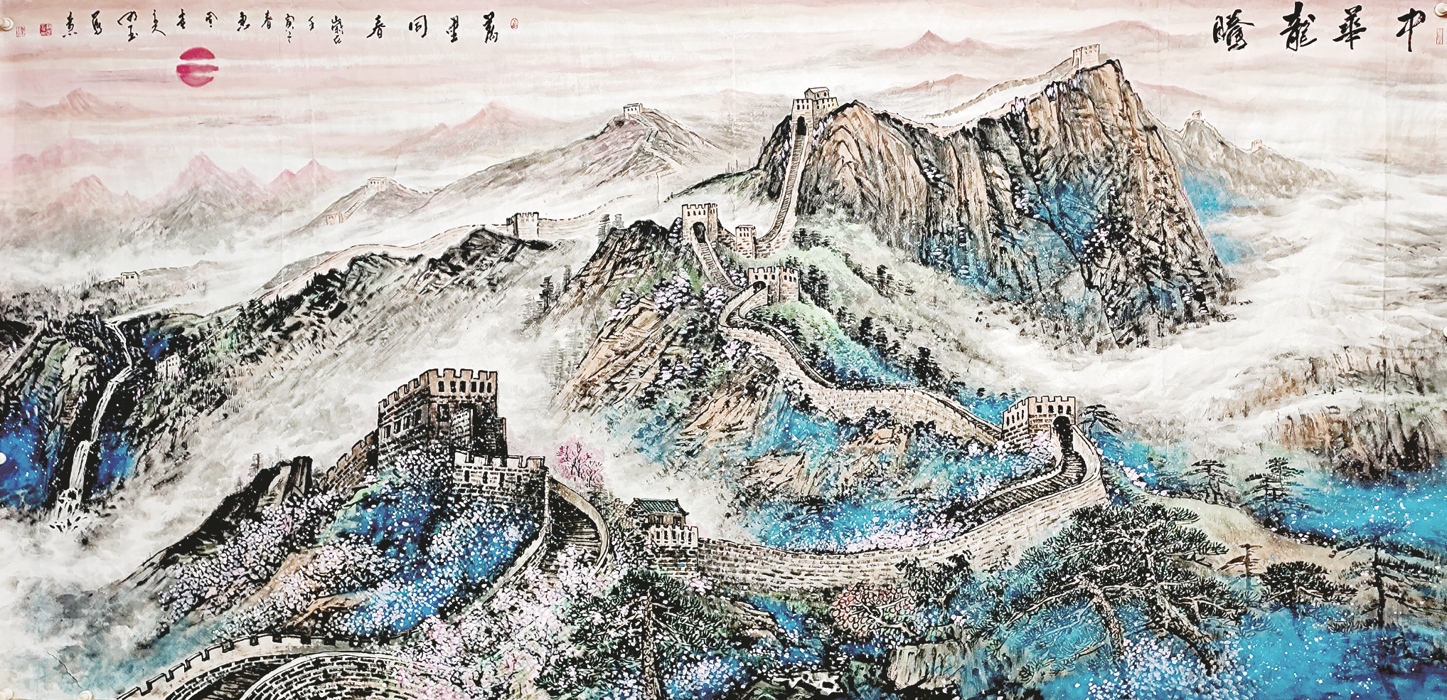 一幅丈二的山水畫卷在他的筆下徐徐鋪陳開來,蜿蜒于群山峻嶺中的長城映入眼簾,高聳的烽火臺沒入遠處的云霧里,忽隱忽現,秦時的長城如一條騰起的巨龍守護著祖國的壯麗河山。山勢陡峭,云霧繚繞,山林層巒疊翠,山下桃花盛開,不僅讓人想起毛主席的詩詞“望長城內外,惟余莽莽,大河上下,頓失滔滔”“雄關漫道真如鐵,而今邁步從頭越”的豪邁和激情。