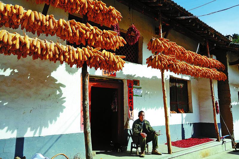 沿著通村路前行,農家的屋檐下架滿了金黃的苞谷穗、紅色的辣椒,農戶曬著太陽吃著早飯,開始了一天的生活。此時的山村正處在最美的時刻,一年的付出都在此時得到回報。