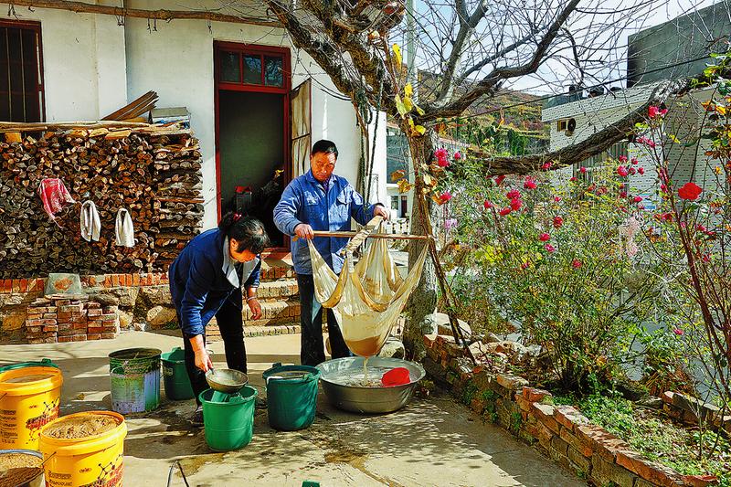 11月初,記者去丹鳳縣蔡川鎮采訪的途中,用鏡頭捕捉到一幅幅迷人的秋景。當汽車在蜿蜒的山路上轉過一道山梁,碧波粼粼的魚嶺水庫映入眼簾,在赤橙黃綠叢林的映襯下,水面顯得更加翠綠,許多過往行人駐足拍照。大約半小時后,我們來到了庵底村,69歲的陳發本和妻子正在院里做紅薯粉。今年夫妻倆收獲了三四百斤紅薯,經過磨碎、過濾、沉淀、晾曬等復雜的工序之后,得到白色的紅薯粉,等到三九寒冬用來做粉條。陳發本的兒子遠在深圳,他準備粉條做好后,給兒子寄去,讓他平常也能吃到家鄉的味道。