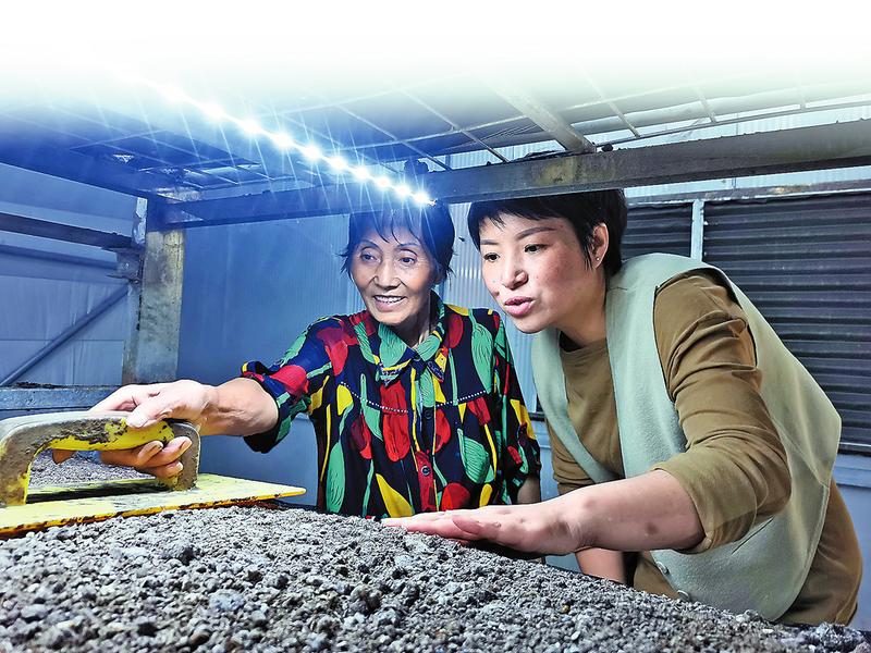 雷亞妮(右)叮囑工人注意平整菌床事項