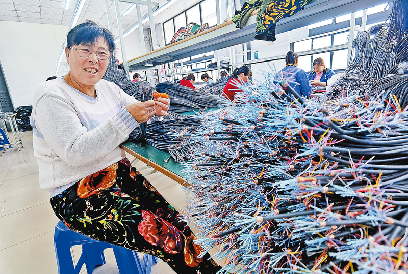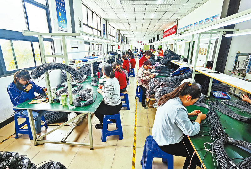 “我住在竹林關鎮(zhèn)丹水社區(qū),在這兒待了5年,月工資2000元左右,活不重,離家近,很靈活,可以照看老人和小孩。”在丹水社區(qū)工廠的商洛萬朋輝電子有限公司車間,丹水社區(qū)居民肖霞一邊忙著加工數(shù)據(jù)線,一邊笑著說。