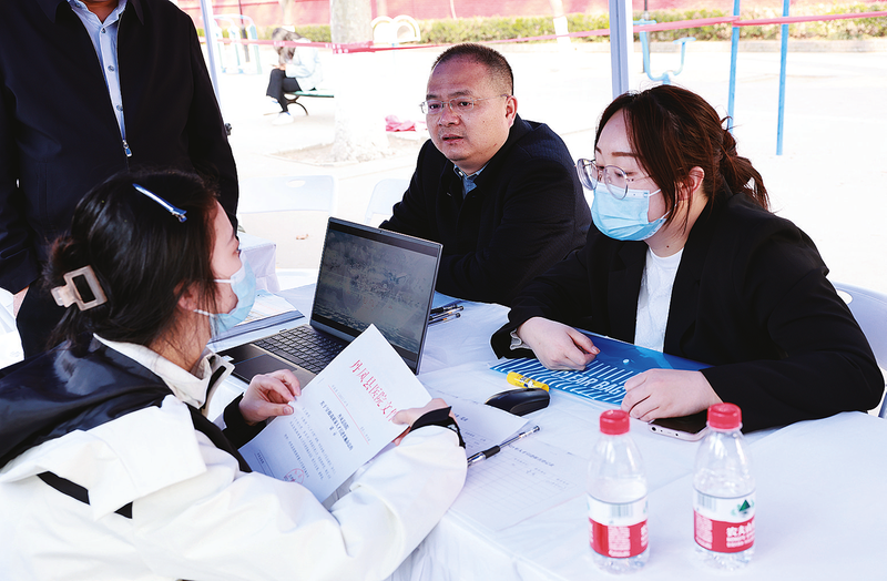 丹鳳縣醫院院長高應東(中)在春季校園招聘會上為醫院引進人才