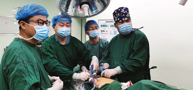 南京市第一醫院楊維軍醫生(左二)帶領普外科醫生進行腹腔鏡脾切除術