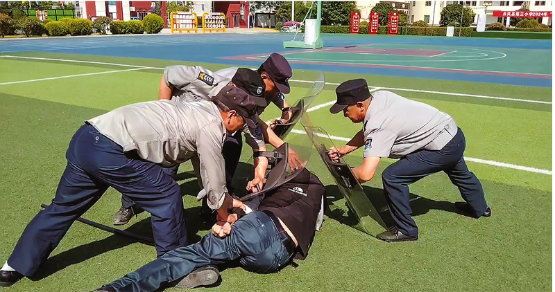 演練前,縣科教體局邀請專業人員對防暴盾牌、鋼叉等防暴器材的功能及使用要點進行詳細講解,現場示范使用方法,并結合實際案例,對如何做好校園防欺凌、門禁工作等進行規范要求,從安保人員、師生等不同角度分別演示了應對突發事件的處置方法。演練采取“實戰化”場景模擬,一名“暴恐分子”持械意欲進入到學校,安保人員發現后,學校立即啟動防暴恐預案,護校隊第一時間趕到大門口,分工協作,配合默契,快速制服侵入校園“暴恐分子”,整個處置過程安全、快速、有序。下一步,丹鳳縣科教體局將強化平安校園創建,深化“護校安園”行動,聯合公安部門通過舉辦安防培訓、校園安全管理能力提升行動,全面提升校園安全管理人員反恐防暴意識及應急處理能力,確保轄區校園平安穩定。