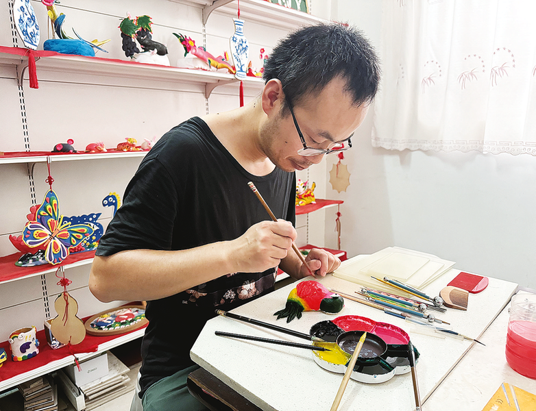 “在制作高臺芯子人物時,我只能參照照片做,除了刻畫人物面部細節,讓八個人物一同立在面團底座上是非常考驗技術的。”遇到難題他多次給師傅何曉錚打電話請教,經過一周廢寢忘食地制作,一組三十公分大小的高臺芯子人物誕生。之后,他根據市場需求用輕黏土做出了風景裝飾畫、卡通人物、畫扇等作品,許多人將他的作品作為禮物贈送給親朋好友。