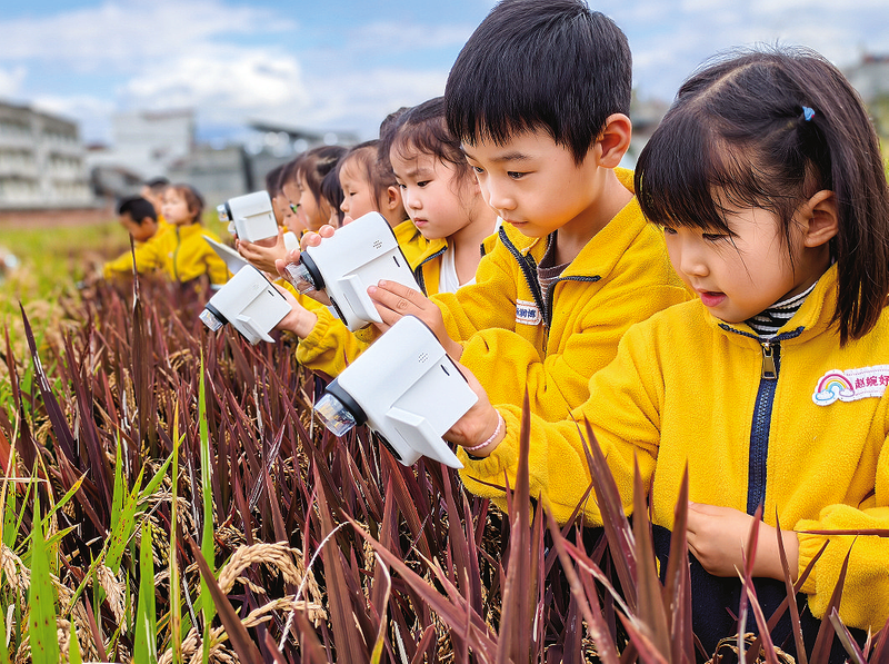 在金色的稻田里,孩子們興致勃勃地觀察飽滿的稻穗,用放大鏡探索稻粒的奧秘,親手收集稻種,沉浸式感受“汗滴禾下土”的辛勞。農技人員現場生動講解旱稻種植知識,帶領孩子們認識稻谷的生長過程,讓他們在實踐中領悟農耕文化的深厚內涵。