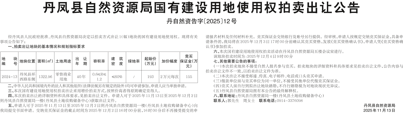 丹鳳縣自然資源局國有建設用地使用權拍賣出讓公告