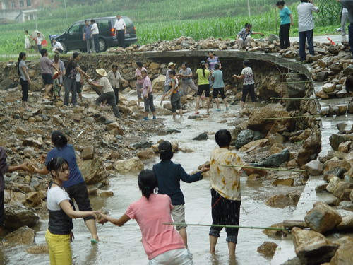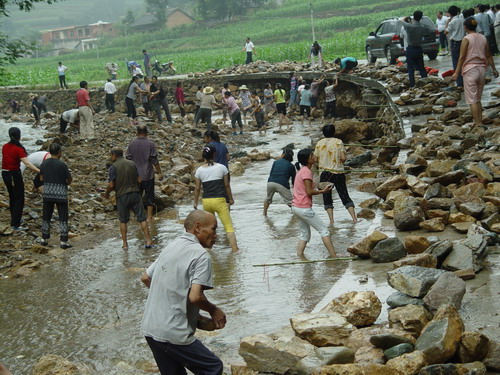 本網訊7月23日上午,商南縣過風樓鎮太平莊村太平莊組百余名男女老少冒著雨、赤著腳站在河里搬運石頭,為修復水毀的150米臨河水 泥路做石料準備。 商南縣在“7.16”洪災中,15個鄉鎮137個村1058個組30309戶105325人不同程度受災,造成直接經濟損失4606萬元。災情發生后,全縣已派出16支工作隊,分赴各鄉鎮查災救災,組織群眾開展災后自救。