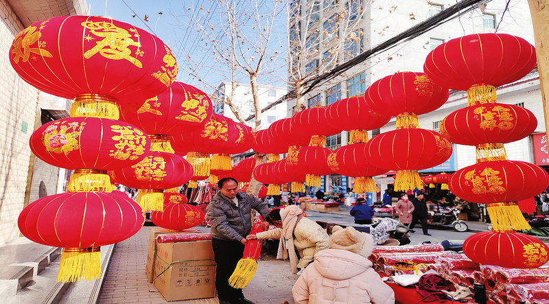 1月25日,記者來到洛南縣城,街道上張燈結彩、裝扮一新,集市上吃的、穿的、用的一應俱全。雖然離過年還有半個月時間,但人們早早就開始置辦年貨,東家買點干貨,西家買幅年畫,提著大包小包,收獲滿滿。