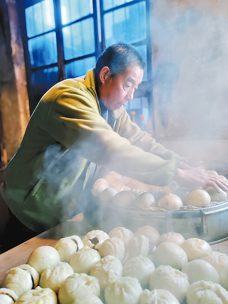繚繞的霧氣中,張鐵柱和妻子忙碌著將新出鍋的饃轉移到干凈的盆子里,面香四溢,升騰的年味兒彌漫著家的溫暖。