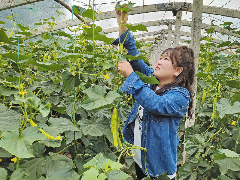 5月30日,洛南縣城關街道尖角村蔬菜種植戶在給黃瓜綁架掐芽。尖角村素有“洛南縣城的菜籃子”之稱,有蔬菜基地680畝,溫室、弓棚229座,主要種植圣女果、黃瓜、草莓、甜瓜等,通過發展休閑采摘,該村126戶268人人均年增收6000多元。 (本報記者 賈書章 攝)