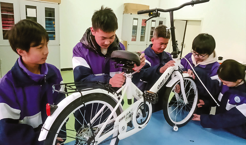 洛南縣第三初級中學學生在勞動實踐課上學習組裝自行車