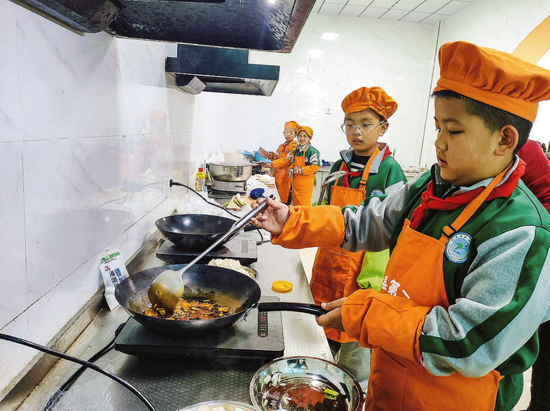 洛南縣第二小學學生在廚藝教室學做家常菜