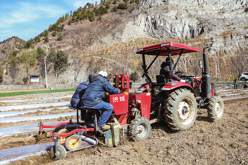筆者走進四皓街道連河村,只見農(nóng)機人員駕駛播種機在地塊平整、規(guī)模較大的田間來回穿梭,進行播種、覆膜;村民三五成群在規(guī)模較小的地塊進行整地起壟、開溝、播種、施肥、覆膜……各項工序有條不紊,不一會兒,一行行覆蓋好薄膜、排列整齊的田壟就呈現(xiàn)在眼前。