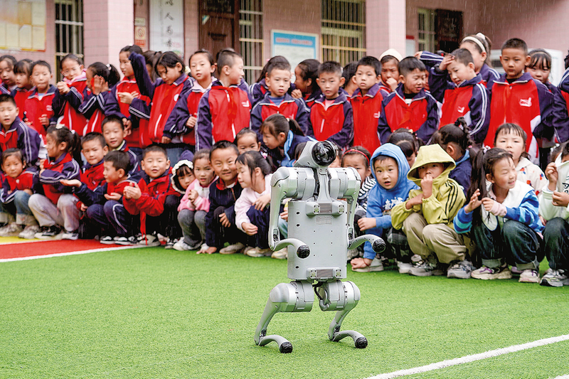 在寺耳鎮中心小學,智能機器狗的倒立表演吸引了同學們圍觀。
