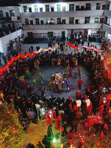 舞獅開場,旱船、花轎、竹馬、花籃……各種表演接著依次登場,燈火齊明,有村民用商南民歌高唱花燈彩詞。最后由龍燈壓軸并引導燈隊轉移場次,走向“接燈”(邀請花燈表演)的各家各戶。