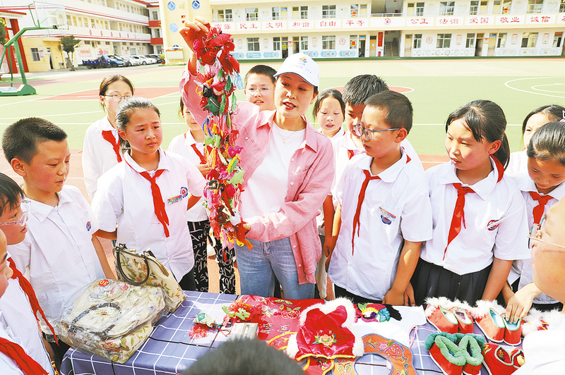 △“非遺進(jìn)校園”走進(jìn)試馬鎮(zhèn)中心小學(xué),商南縣文化館工作人員為學(xué)生介紹商南非遺手工香包。(商南縣文化館供圖)