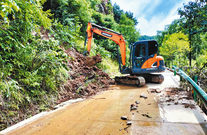 7月22日,山陽縣王閻鎮靳家河村水毀路段,鎮村干部正組織人員采用“人工+機械”方式,抓緊修復和搶通公路,全力以赴保障群眾恢復正常生產生活。 (本報通訊員 蔡彥君 攝)