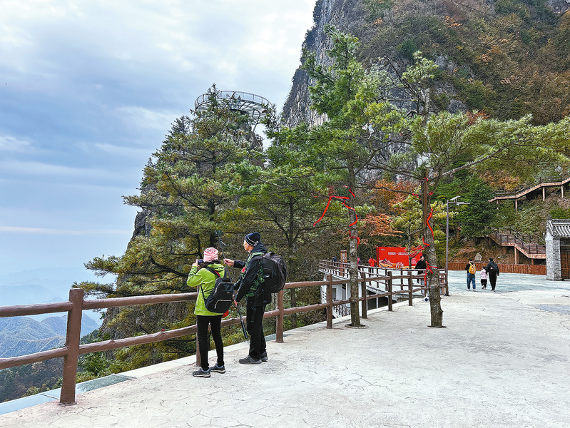金秋時節,秦嶺天竺山景區漫山遍野的樹葉由綠轉黃、由黃轉紅,色彩斑斕,微風拂過,仿佛徜徉于旖旎畫卷,吸引了大批游客前來游覽觀賞。圖為10月26日,游客在天竺山景區觀賞紅葉、拍照打卡。 (本報記者 黃朝梅 攝)